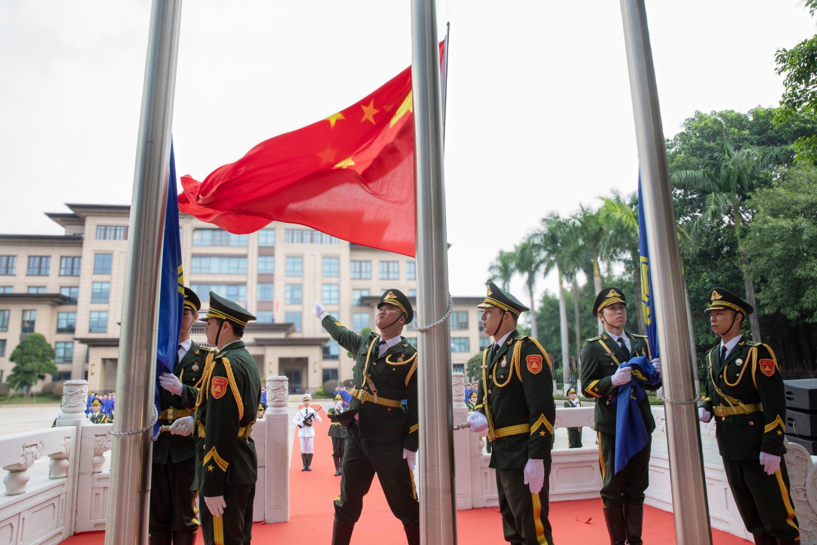 在全體人員肅穆的注視下,伴隨著雄壯的《義勇軍進行曲》,鮮艷的五星紅旗冉冉升起,迎風飄揚。